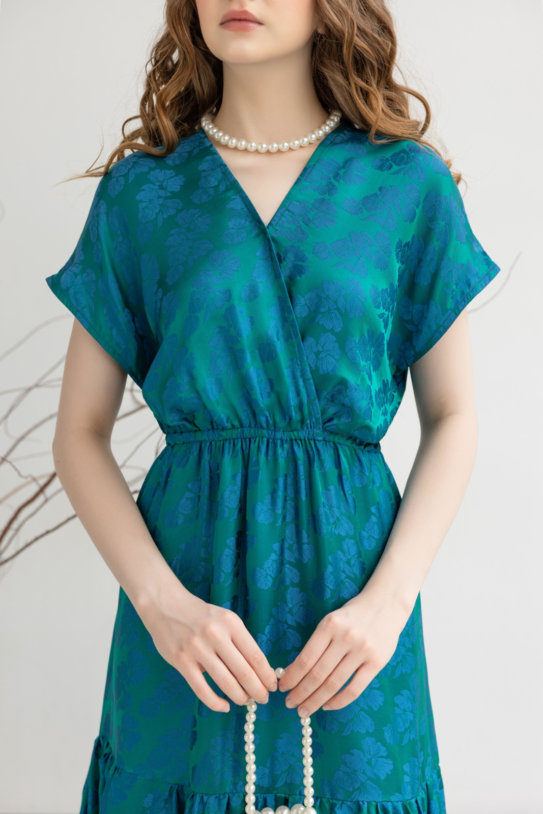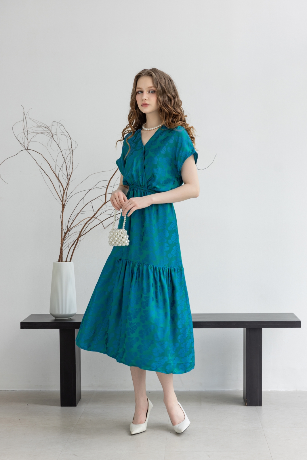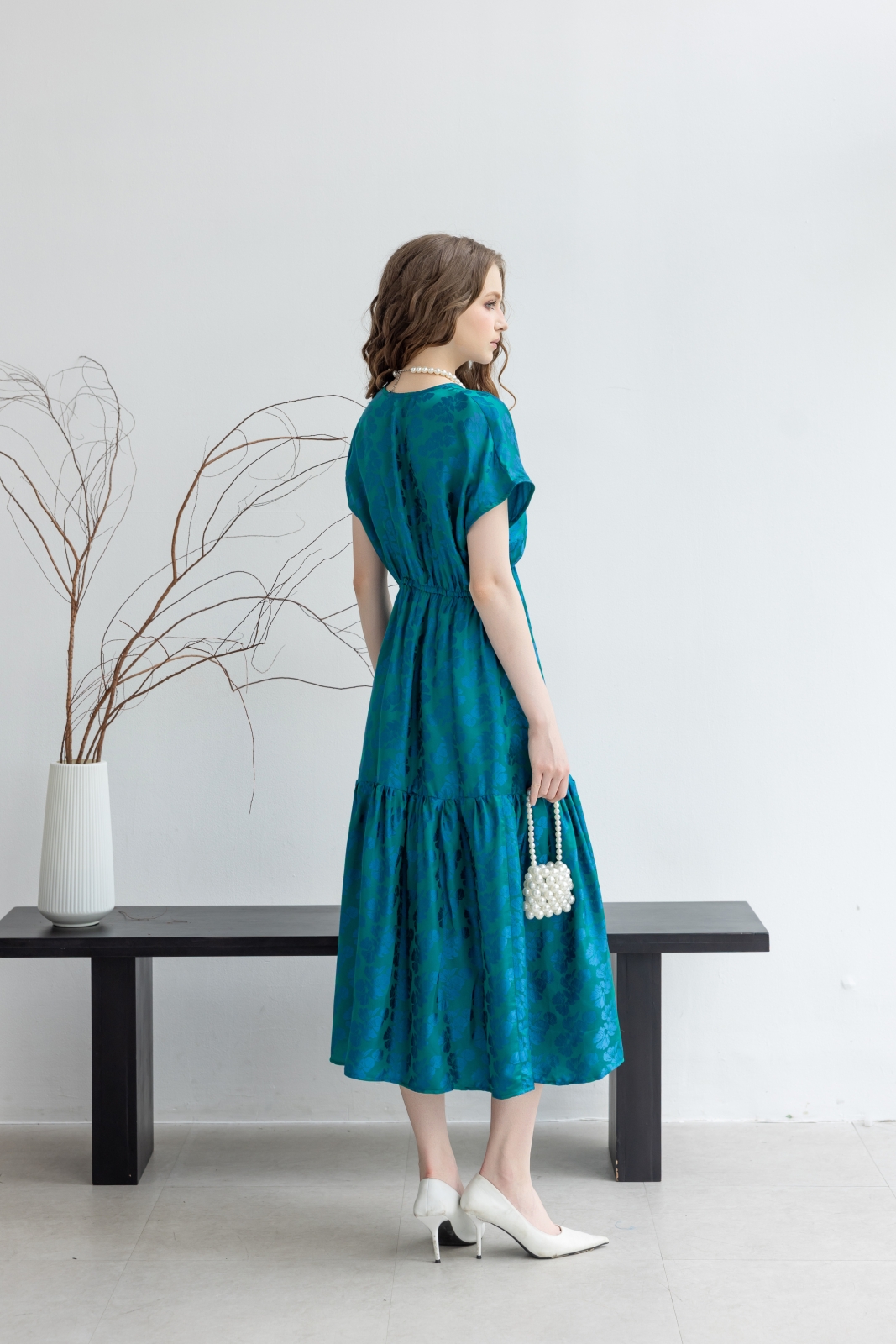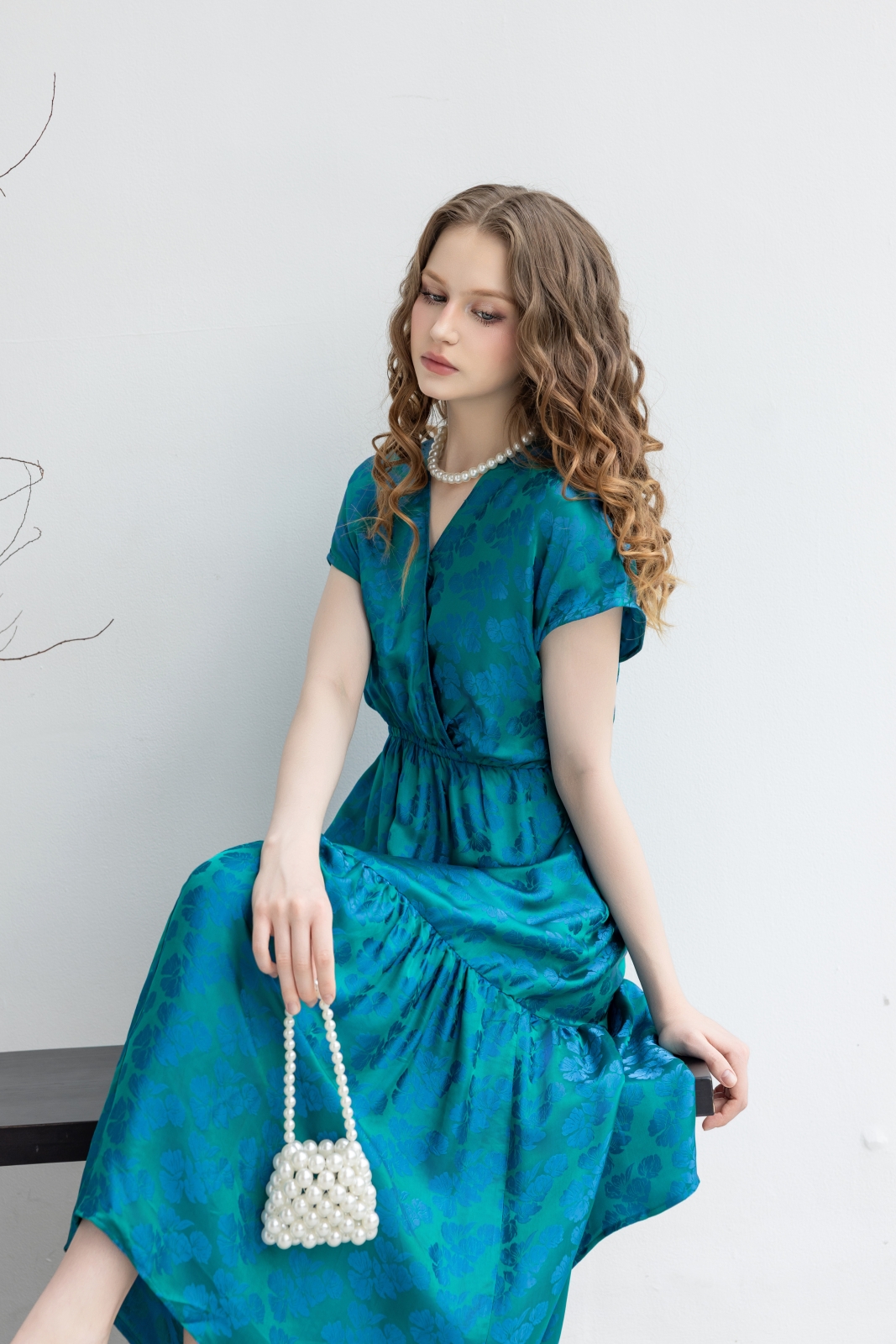 Emerald Grace is a sophisticated silk dress in a charming emerald green hue, inspired by the refreshing beauty of spring days. Crafted from premium silk with delicate jacquard patterns, the dress shimmers subtly under the light, creating an enchanting effect.