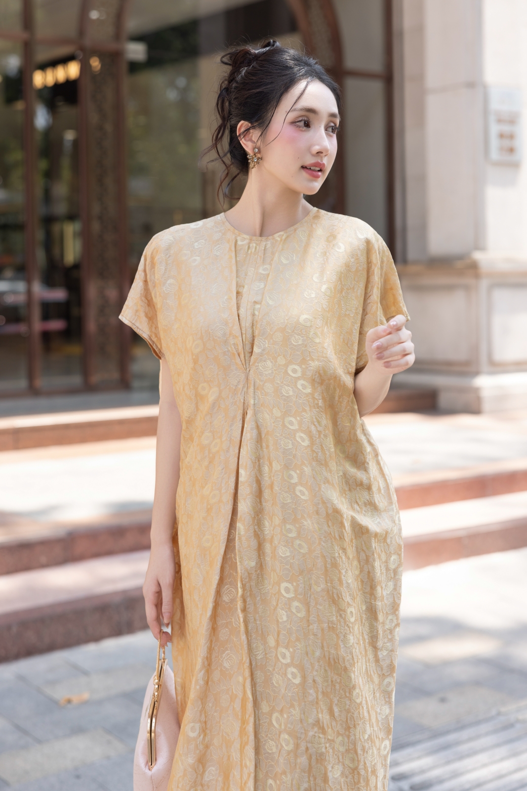"Mộc Sương" là hiện thân của sự giản dị được gói trong vẻ đẹp thanh cao. Tông vàng nhạt dịu nhẹ như nắng sớm, kết hợp cùng họa tiết gấm chìm đầy tinh tế, mang lại cảm giác vừa gần gũi vừa sang trọng.